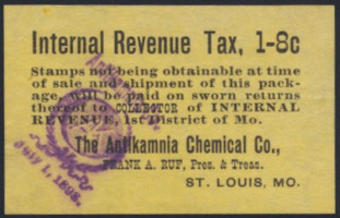 In 1898, eleven proprietary drug companies, 10 in St. Louis, made a deal with the IRS to print their own proprietary tax stamps for use until the delayed federal tax stamps arrived. These came to be known as the St. Louis Provisionals. Want one? Get your checkbook out. Most of them have a five-figure value!